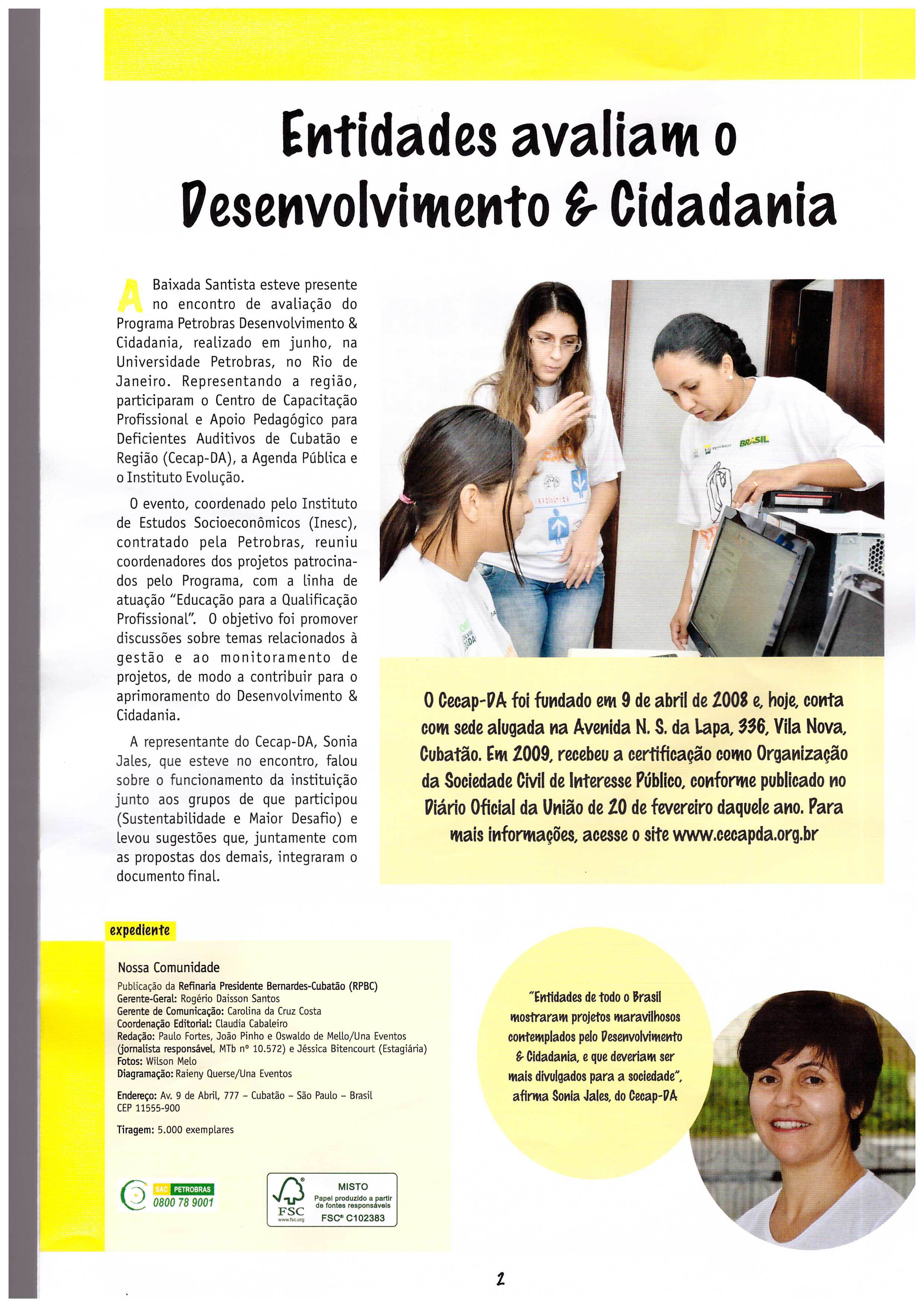 O jornal de agosto de 2013 da Petrobras NOSSA COMUNIDADE, publicou na matéria Entidades Avaliam o
